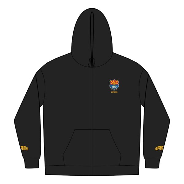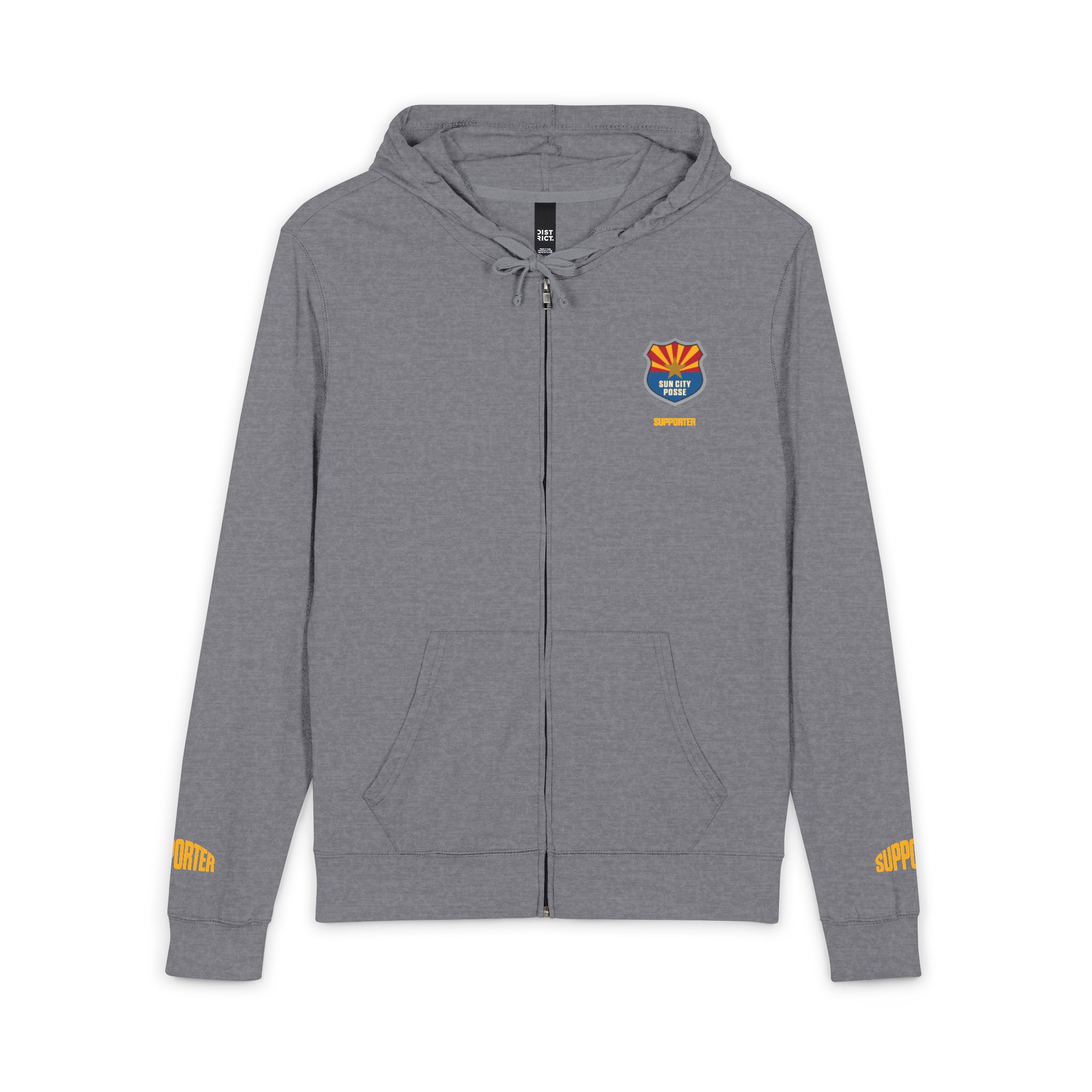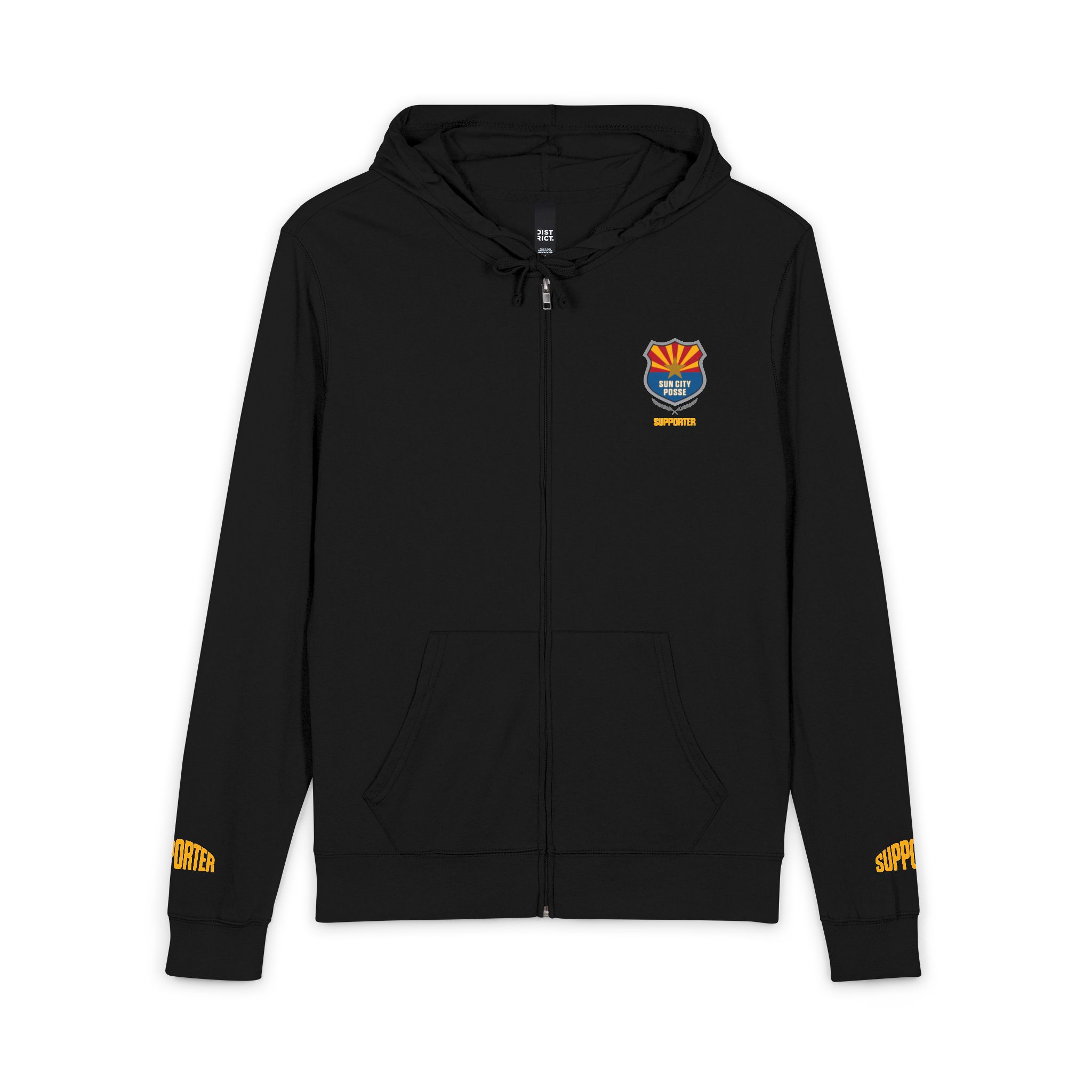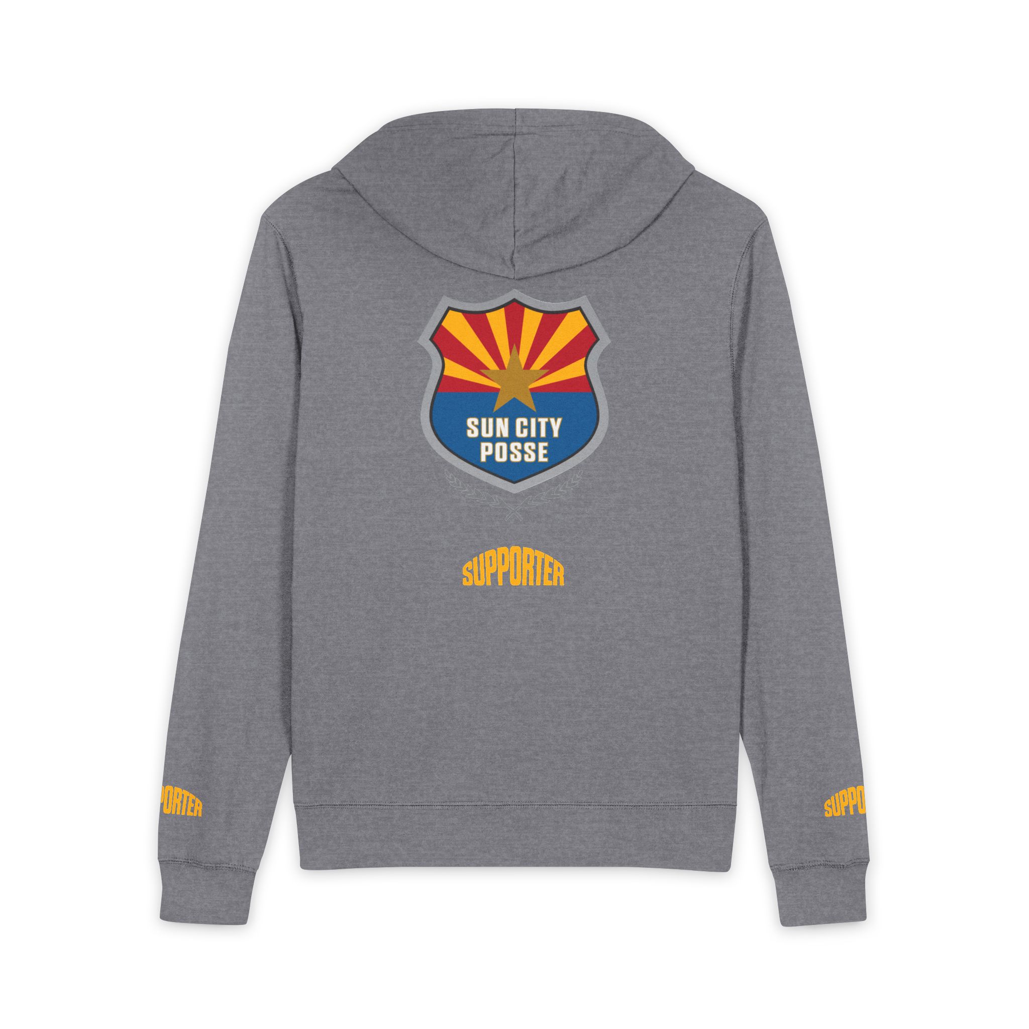 Stay comfortable and show your Sun City Posse pride with this lightweight full-zip hoodie. It features a clean, compact crest on the front and a larger shield emblem on the back—both inspired by our desert home and the spirit of community that makes Sun City special. Soft, breathable, and easy to layer, this hoodie is perfect for cool evenings, morning walks, or tossing on for everyday errands. The smooth zipper, matching drawcords, and relaxed fit make it a go-to piece you’ll reach for again and again. With ribbed cuffs for a neat fit and a tear-away tag for extra comfort, it’s built to feel great from the moment you put it on.